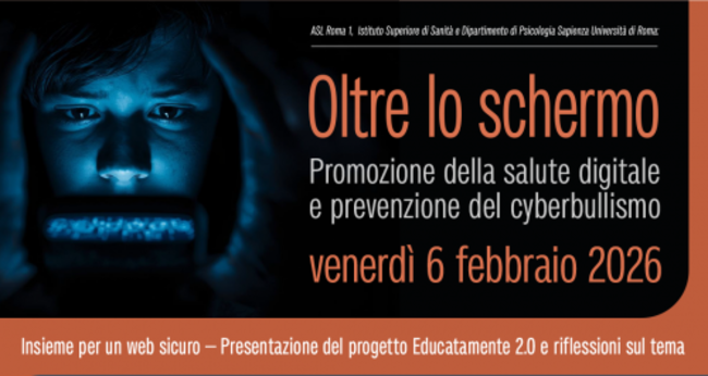 Si terrà venerdì 6 febbraio, a partire dalle 9:15, presso l'aula Pocchiari dell'Istituto Superiore di Sanità - Viale Regina Elena 299, il convegno “OLTRE LO SCHERMO: Insieme per un web sicuro”, organizzato dall’Istituto Superiore di Sanità, in collaborazione con ASL Roma 1 e il Dipartimento di Psicologia della Sapienza Università di Roma. L’evento, parte del progetto Educatamente 2.0, si focalizzerà sulla promozione della salute...